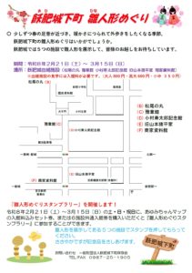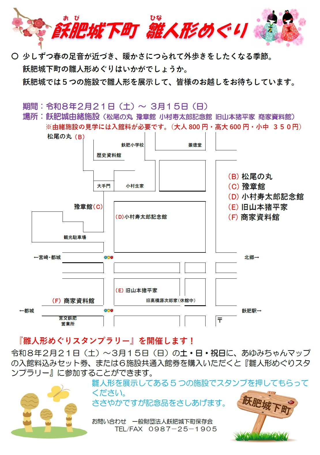 おしらせ イベント オススメ 『飫肥城下町 雛人形めぐり』開催 2026.2.19 Tweet Share RSS 今年も飫肥城由緒施設で雛人形の展示を行います。期間は令和8年2月21日(土)~3月15日(日)です。会場は、松尾の丸・予章館・小村寿太郎記念館・旧山本猪平家・商家資料館の5カ所になります。また、この期間の土・日・祝日に、6館共通入館券かあゆみちゃんマップセット券を購入されるとスタンプラリーの用紙をお渡ししますので、雛人形を展示してある施設でスタンプ5つを集めて記念品をもらってください。 Tweet Share RSS 投稿者: staff おしらせ, イベント, オススメ 飫肥城の除夜の鐘をつく会の開催 前の記事